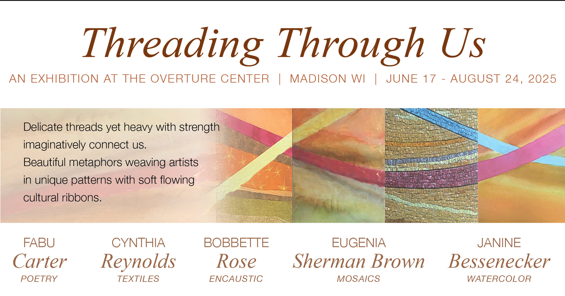 Included in the group are Fabu Phillis Carter (Madison's first African American poet laureate), Bobbette Rose (encaustic), Cynthia Reynolds (textile/mixed media), Janine Bessenecker (watercolor), and Eugenia Sherman Brown (mosaic).